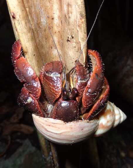 Like our American crows, Mariana crows are generalists and eat a wide variety of foods from insects, to geckos, to fruits and seeds.  But adult Mariana crows have one other food source they’ve come to specialize on: the humble hermit crab. Despite the presence of hermit crabs near other species of corvus, the Mariana crow’s frequent predation on them is unique, especially when you look at how they extract them.  Unlike most coastal or inland living crows that drop tough objects like clams or nuts onto hard surfaces to open them, the Mariana crow actually uses its bill to peck and break the shell at the seams to extract the vulnerable crab, a process that takes place entirely on the ground and is only shared by two other known bird species in the world (one of which is now extinct).  So what does this have to do with wanderlusting snails?  As it turns out, everything.