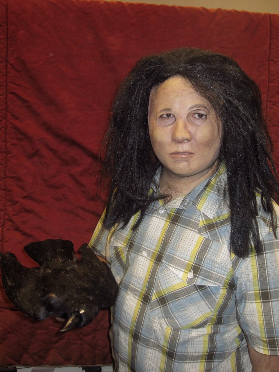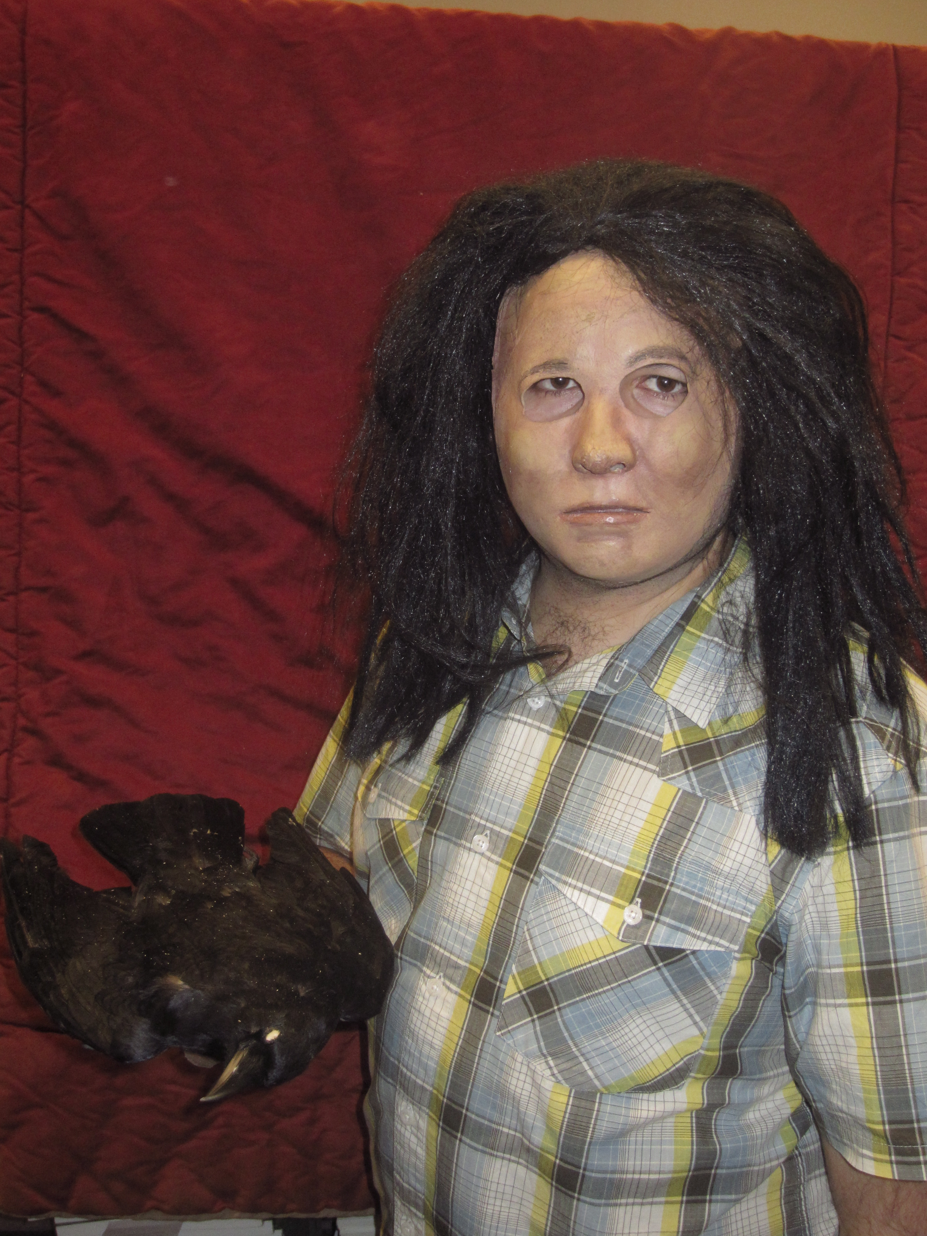 An example of one of our masks holding our dead crow.
